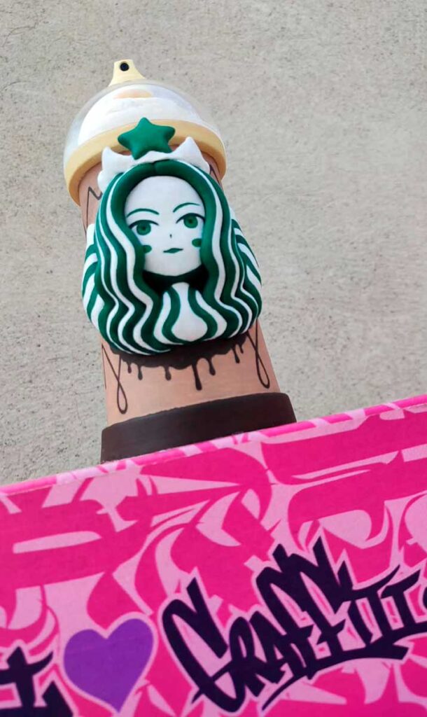 Inspirada en la crema batida y el chocolate derretido, diseñé un chorreado que al reverso forma mi tag: Koregore. Además, incorporé a la Melusina de Starbucks, no solo por la referencia a la bebida, sino por su simbolismo místico vinculado a Lilith. En la astrología, esta figura representa la energía salvaje, la independencia y la transgresión. Así nació la «Kaffeine Queen»: una pieza que no es sólo una bebida empalagosa, sino una declaración de rebeldía y libertad.