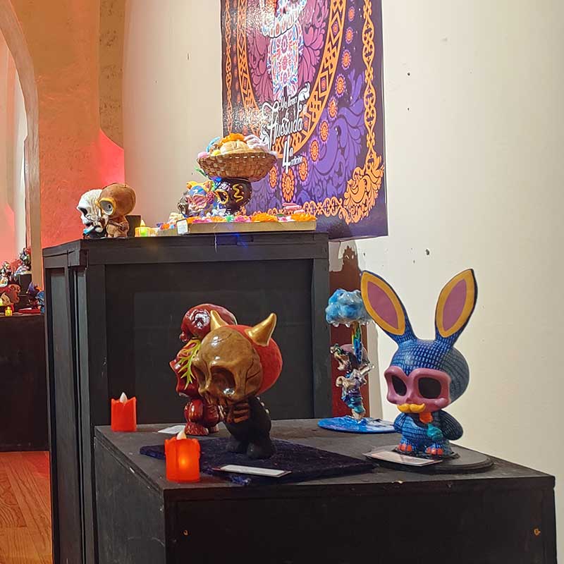 Después de la Plaza de la Democracia donde vimos una serie de calacos monumentales, nos dirigimos al Museo de Arte San Pedro, que es un espacio dedicado principalmente al acervo pictórico novohispano del siglo XIX. Ha sido sede de importantes exposiciones internacionales y nacionales, en las que se ha dado cabida a todas las expresiones artísticas del hombre, desde las arqueológicas hasta las contemporáneas. Antes de la inauguración de la expo de art-toys miniatura, exploramos los alrededores del Museo y nos encontramos con una ofrenda, varias calacas de cartonería y una colección de hojaldras (el pan de muerto tradicional de México) hechas de cartonería y decoradas con distintas corrientes artisticas y autores del arte moderno como: Fiedrich, Van Gogh, Dali, Hilma af Klint, Mondrian, entre otros. Puedes apreciar algunas de estas obras de Arte Popular Mexicano, en el siguiente video: